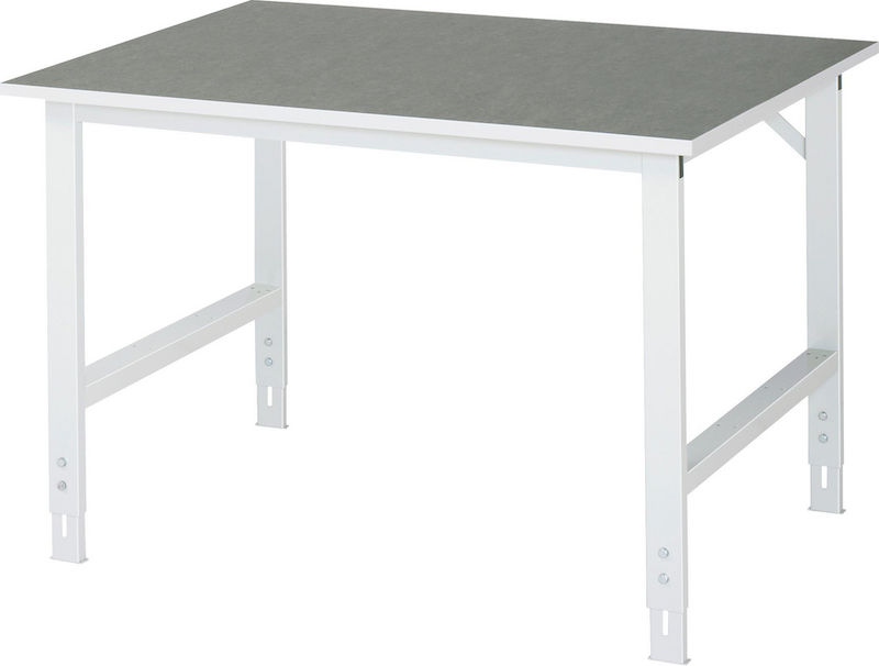 Arbetsbord Rickard, underrede 60 x 30 mm, linoleumskiva, BxD 1250 x 1000 mm, ljusgrå. Stabilt funktionsunderrede av stålrör med fotelement, tvärstag och förstärkningar. Miljömärkt pulverlackering.