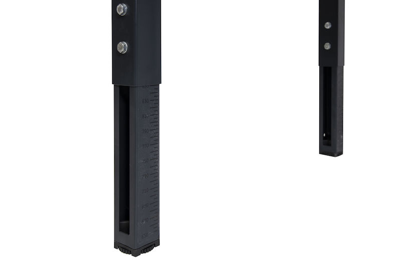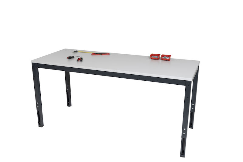 Arbetsbord Saga, arbetshöjd 650 – 900 mm, BxD 1800 x 900 mm. Manuell höjdinställning på bordsfoten via insexskruvar.