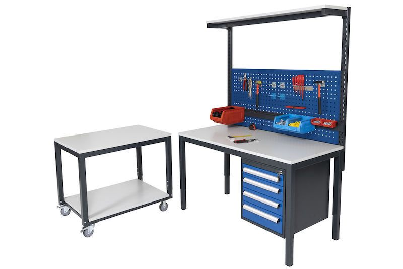 Stålrörsram, 45 x 45 mm, pulverlackerad i svart. Melaminbelagd bänkskiva, 25 mm tjock. Latskapacitet ca 400 kg vid jämnt fördelad last.