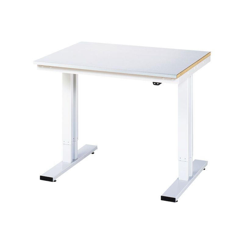 Höj och sänkbart Arbetsbord Dagfinn, höjd 720 – 1120 mm, stålplåtsbelagd skiva, BxD 1000 x 800 mm. Tyst, steglös och absolut synkron inställning av arbetshöjden med upp till 400 mm genom lyftpelare med integrerad linjärdrivning. Inställningsväg 38 mm/s (utan last).