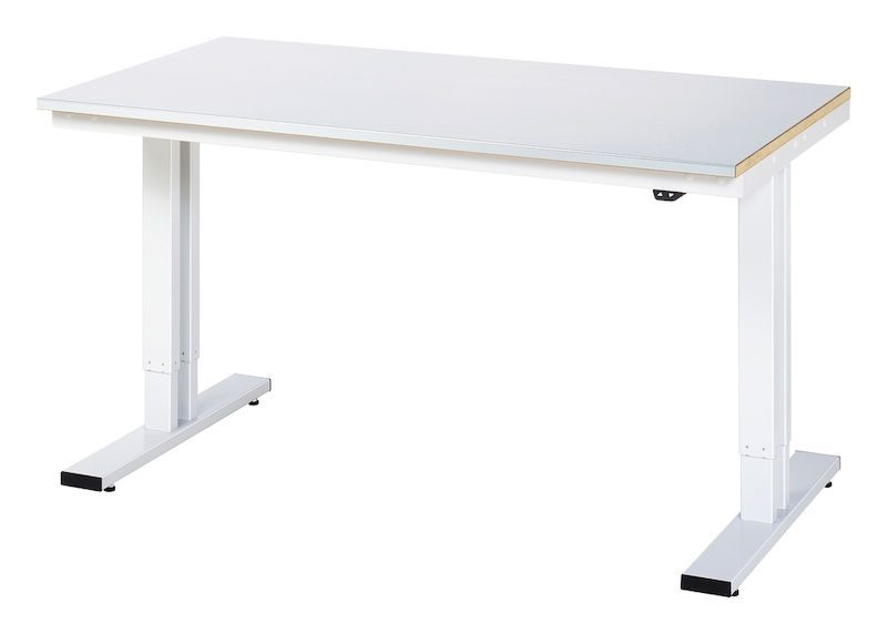 Höj och sänkbart Arbetsbord Dagfinn, höjd 720 – 1120 mm, stålplåtsbelagd skiva, BxD 1500 x 800 mm. Tyst, steglös och absolut synkron inställning av arbetshöjden med upp till 400 mm genom lyftpelare med integrerad linjärdrivning. Inställningsväg 38 mm/s (utan last).