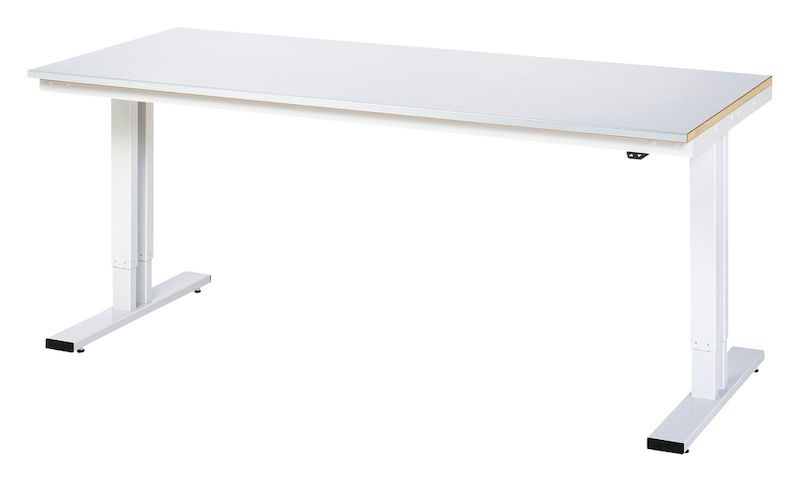 Höj och sänkbart Arbetsbord Dagfinn, höjd 720 – 1120 mm, stålplåtsbelagd skiva, BxD 2000 x 800 mm. Tyst, steglös och absolut synkron inställning av arbetshöjden med upp till 400 mm genom lyftpelare med integrerad linjärdrivning. Inställningsväg 38 mm/s (utan last).