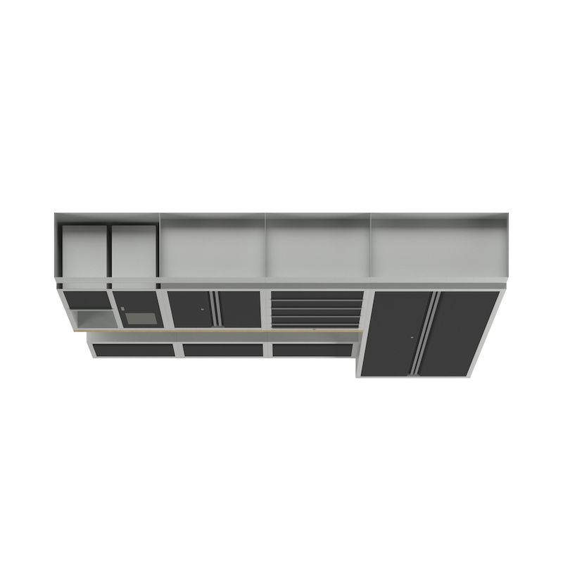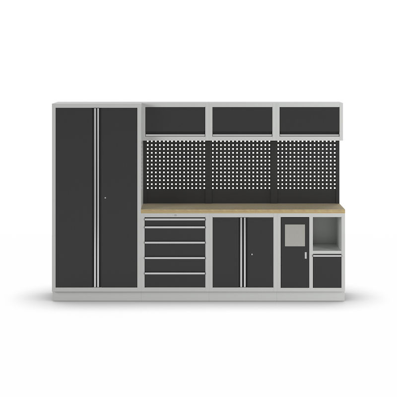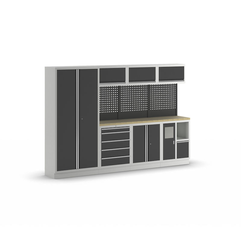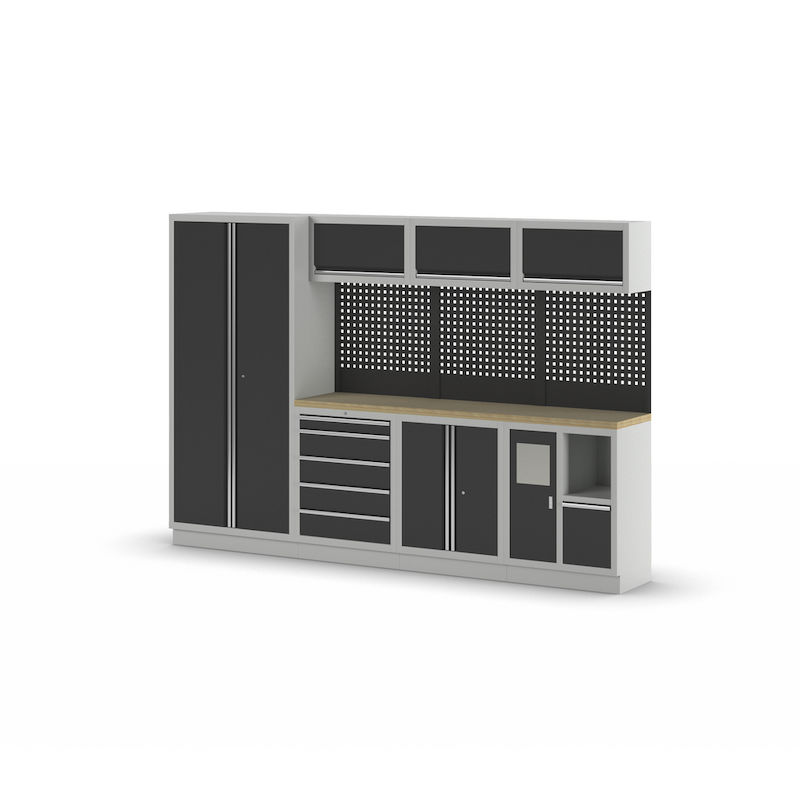 Verkstadsinredning Tekla, 1 skåp, 3 väggskåp, 3 underskåp, antracitgrå. 2 underskåp med respektive HxBxD 910 x 680 x 460 mm, pulverlackerad stålkonstruktion. Ljusgrå stomme RAL 7035, antracitgrå luckor RAL 7016. Bänkskiva av multiplex, 36 mm tjock.