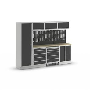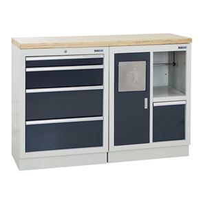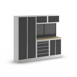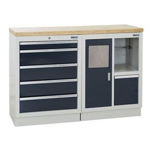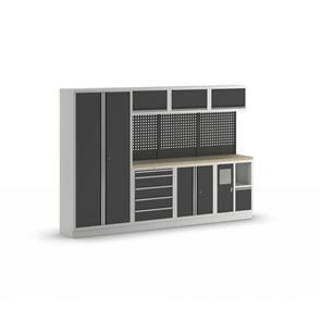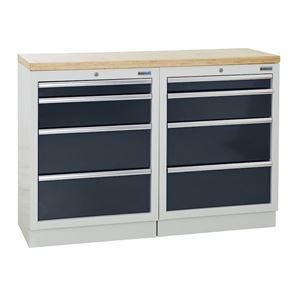 Verkstadsinredning Tekla, 2 skåp med vardera 5 lådor, antracitgrå. 2 underskåp med respektive HxBxD 910 x 680 x 460 mm, pulverlackerad stålkonstruktion. Ljusgrå stomme RAL 7035, antracitgrå luckor RAL 7016. Bänkskiva av multiplex, 36 mm tjock.