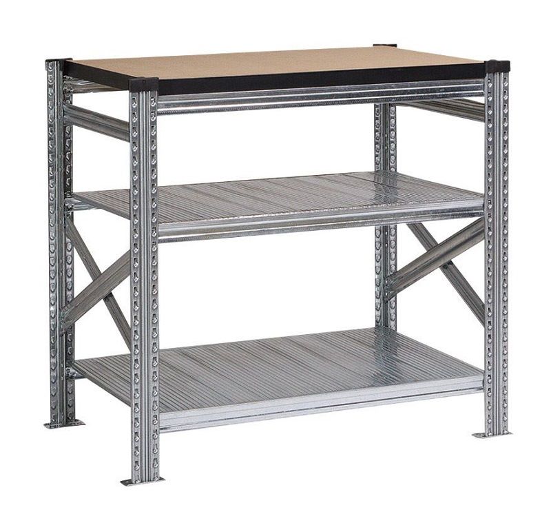 Arbetsbänk Flex, 4 låga stolpar, HxB 916x975 mm, en flexibel arbetsbänk av galvaniserat stål med bänkskiva av härdad oljeboard. Finns i flera längder och utförande.