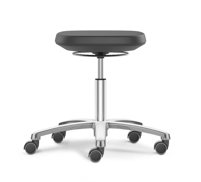 Åkstol Amy. Den mångsidiga arbetspallen tar lite plats och plockas enkelt fram vid behov av tillfälliga sittplatser. Pallen har en genomtänkt design med få skarvar för enkel rengöring och desinficering. Sits av Soft-Touch PU-skum i svart med rundad framkant. Soft-Touch PU-skum är ett extremt robust och samtidigt mjukt material som är lättskött, desinfektionsmedelsbeständigt och resistent mot flygande gnistor. Sittytans kvadratiska form erbjuder gott om plats. Via gasfjäder med ringaktivering kan höjden ställas in från 450 till 650 mm. Sitthöjden anpassas enkelt medan du sitter på stolen. Den stabila kryssfoten i blank aluminium har lastberoende dubbelhjul med broms för hårda golv.