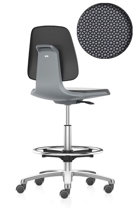 Arbetsstol Bimos Labsit, högstol med sittbromshjul och fotring, sits Supertec, antracit. PU-skum är extremt motståndskraftigt mot mekanisk belastning samt lätt att rengöra och desinfektionsmedelsbeständigt. Tygklädseln som andas ger hög sittkomfort. Den bekväma konstläderklädseln är lätt att rengöra och desinfektionsmedelsbeständig. Supertec®-klädseln har en noppig struktur och är extremt nötnings-, slitage- och rivtålig.