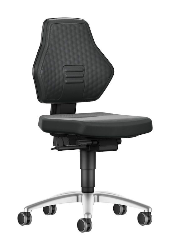 Hjulen bromsas lastberoende, det vill säga vid belastning rullar stolen lätt, utan belastning bromsar hjulen för att hindra stolen från att rulla iväg. Som standard ingår mjuka hjul för hårda industrigolv. Sitsen har justerbar höjd mellan 450–620 mm.