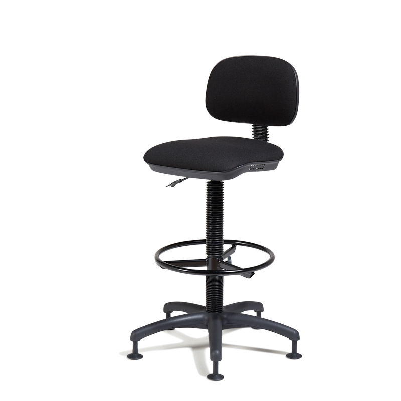 Arbetsstol Potos. En stabil höj- och sänkbar arbetsstol klädd i tyg med enkel och funktionell mekanism. Stolen levereras med glidfot och fotring.