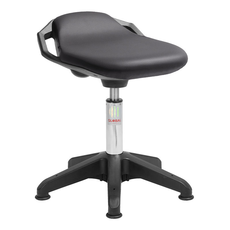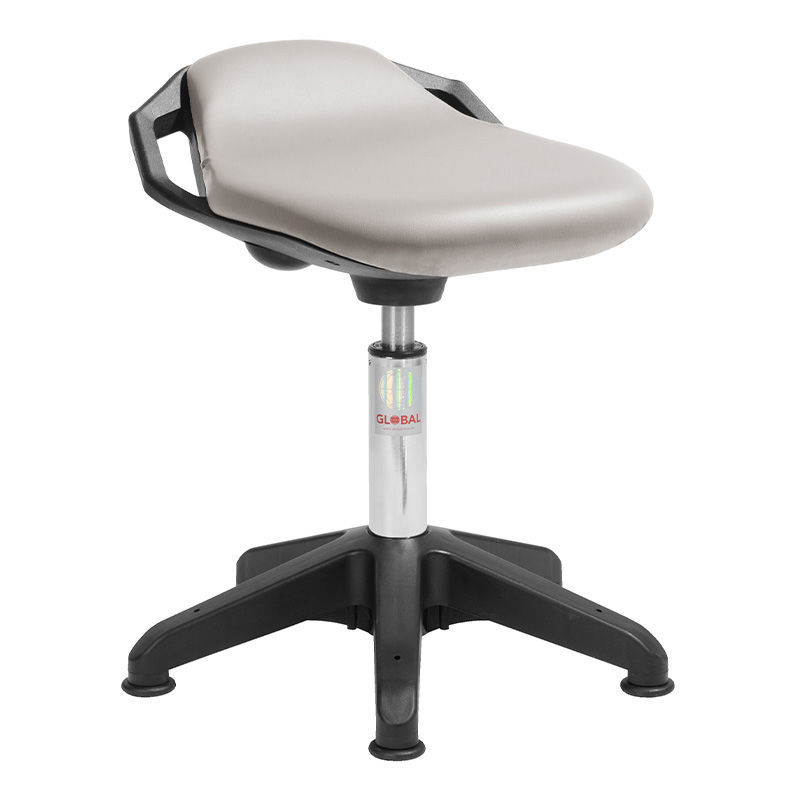 Ståstödstol Odette. Allroundstol med god sittkomfort, och behagligt stöd för ländryggen. Handtag vid sidorna gör att den är lätt att flytta runt. Sitsen är klädd i konstläder, vilket gör att den är lätt att hålla ren, och stoppning av kallskum gör den mjuk och skön. Ståstödstolens höjd regleras med gaspatron. Odette finns i olika färger och med glidfötter eller hjul.
