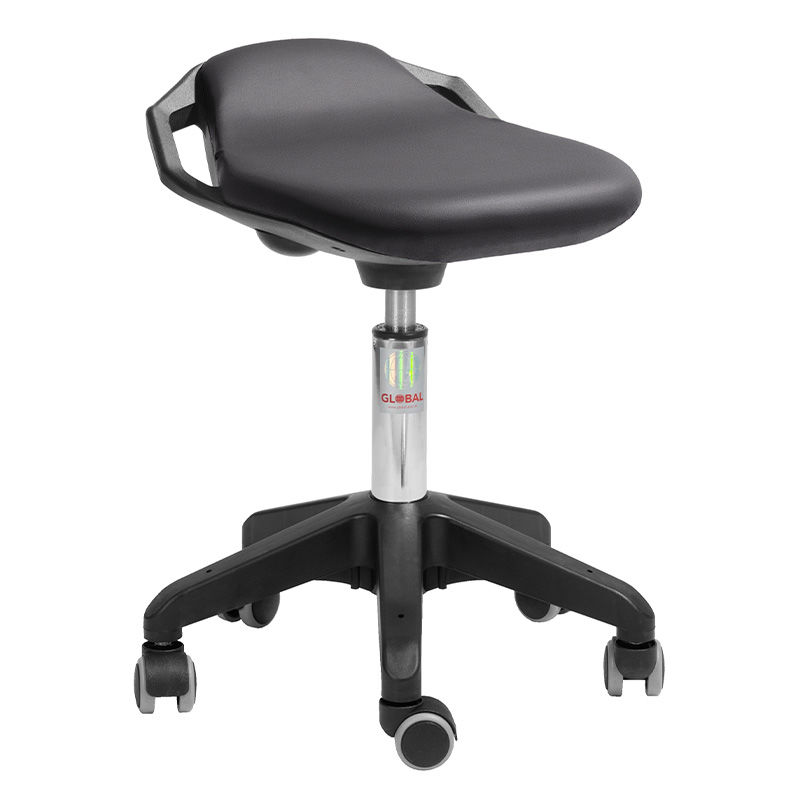 Ståstödstol Odette, med hjul, H 470-600 mm, svart. Allroundstol med god sittkomfort, och behagligt stöd för ländryggen. Handtag vid sidorna gör att den är lätt att flytta runt. Sitsen är klädd i konstläder, vilket gör att den är lätt att hålla ren, och stoppning av kallskum gör den mjuk och skön. Ståstödstolens höjd regleras med gaspatron. Odette finns i olika färger och med glidfötter eller hjul.