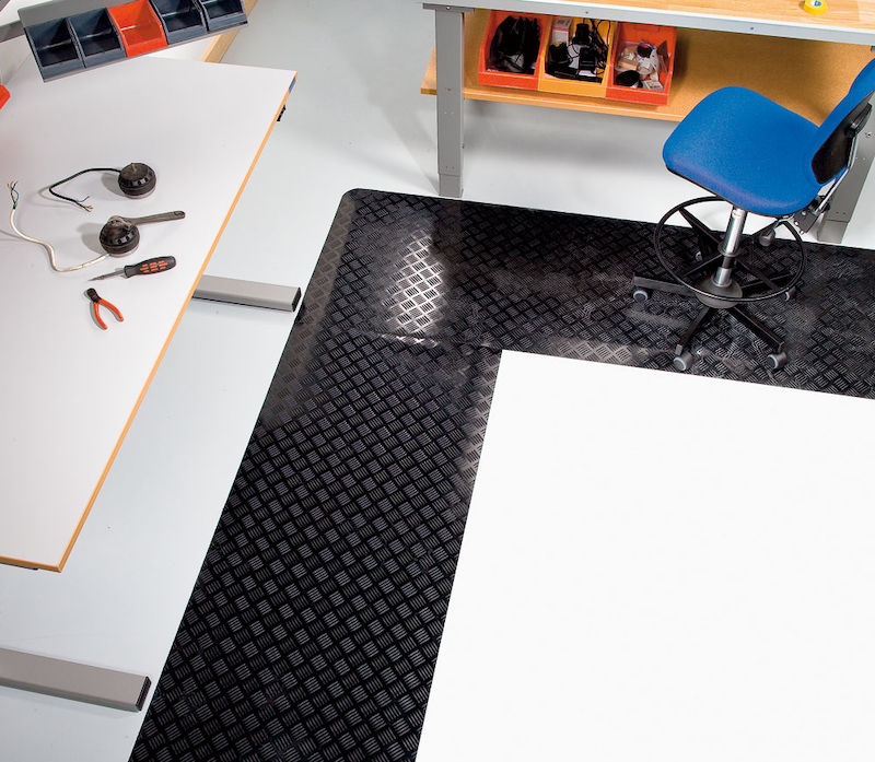 Undersidan av cellgummi och samtliga kanter är fasade för att minimera snubbelrisken och göra det möjligt att köra upp med vagn. Mattan tål vissa oljor, väta och stänk men kan ej stå i väta. Svensktillverkad durkmatta i ESD-utförande. Tjocklek 11 mm.