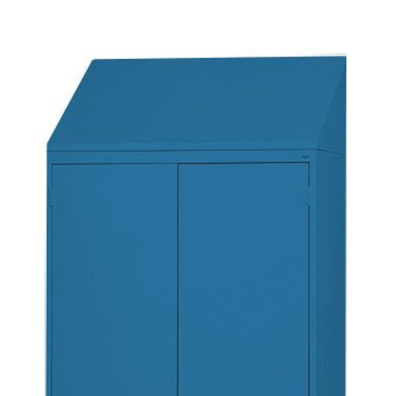 Snedtakshuv till Verkstadsskåp Rex, H 345 mm, blå. Undvik att toppen av ditt skåp blir en avlastningsyta för saker, snedtakshuvan underlättar även städning av damm. Höjd 345 mm, finns i två färger, vit eller blå.