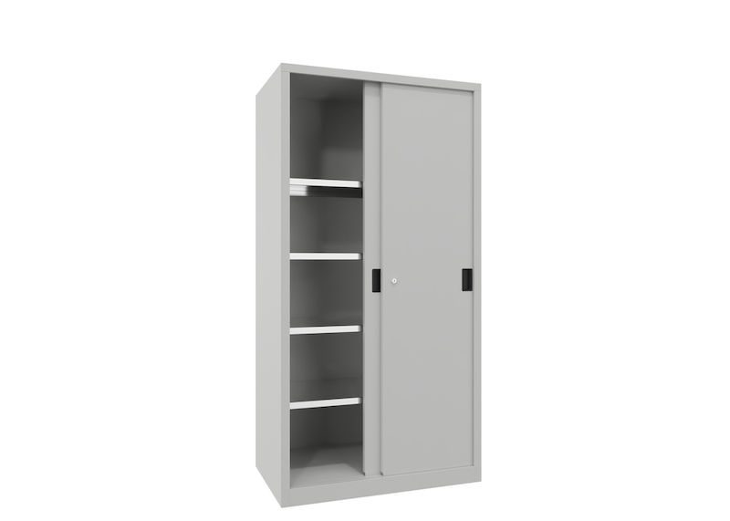 Verkstadsskåp med skjutdörrar Ellinor, höjd 1950 mm, dörrar helt i plåt, BxD 1000 x 600 mm, med 4 hyllplan, dörr ljusgrå. Skåp med skjutdörrar – platsbesparande och effektivt