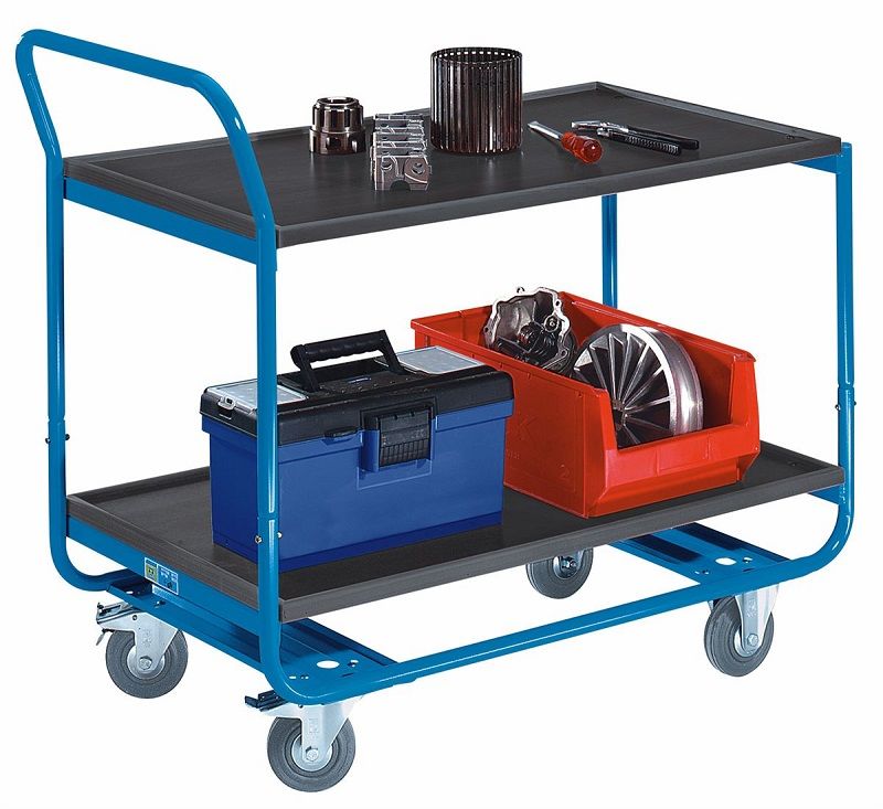 Verkstadsvagn MDF. En bordsvagn med en lastkapacitet på 150 kg. Kommer med 2 hyllplan av MDF-skiva. Storlek LxB 1000x570 mm. En vagn som har många användningsmöjligheter, t.ex. på lagret, i produktionen, vid montering, i distributionen eller i arkivet. Stativ pulverlackerat som standard i ljusblå färg (RAL 5012). Med 2 länkhjul och 2 fasta hjul, alla hjul med rullager. Länkhjul kommer med dubbelbroms som standard enligt EN 1757-3. Finns med två olika hjultyper, massivgummihjul eller luftgummihjul.