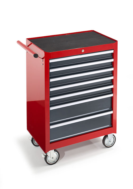 Verktygsvagn Arne, HxBxD 995 x 680 x 458 mm, 7 lådor, röd. Stabil, pulverlackerad stålkonstruktion. Låda utdragbar till 100% på kullagrade teleskopskenor. Antracitgrå. Handtag med märkningsmöjlighet, inklusive pappersremsa och transparent skydd.