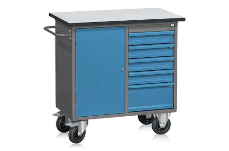 Verktygsskåp på hjul Leon, HxBxD 925x1000x600 mm, blå/grå. Ett praktiskt verktygsskåp på hjul med arbetsplatta och lådor för smådelsförvaring.